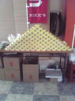コーヒーを買って会場に戻ったら、受付では「ちんすこうピラミッド」作って、お客さんの来場を待つばかり〜となっておりました。