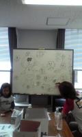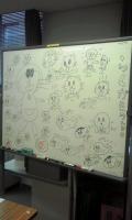ホワイトボードいっぱいに3人がなぐり描き、そのホワイトボードはまるでらくがきランド。